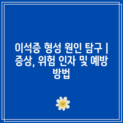 답변. 이석증 형성 위험을 높이는 요인으로는 탈수, calcium과 옥살레이트가 많은 식단, 특정 의학적 상태(통풍, 갑상선 문제), 가족력 등이 있습니다.